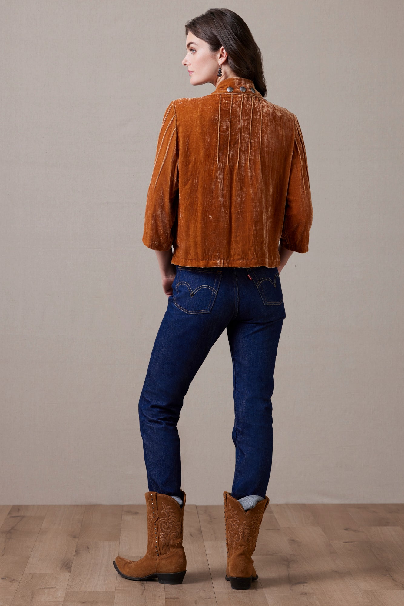 Exclusive to StyleWest, the Double D Ranch Daughter of the Moon Top lets velvet steal the show once again. Crafted in rich, saturated hues, this collared ¾-sleeve silhouette brings timeless Western elegance with a modern edge. Pintuck detailing pairs with chic studding and custom concho-style buttons, while the cropped cut and relaxed body make it a versatile favourite for every season.