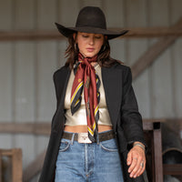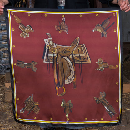 Take A Seat in the saddle! This beautiful new wild rag is adorned with saddle art by artist Pam Benke from Billings, MT. Western saddles, mixed with a preppy, streamlined and simple background/border combo, makes for just the right addition to your Western wardrobe.