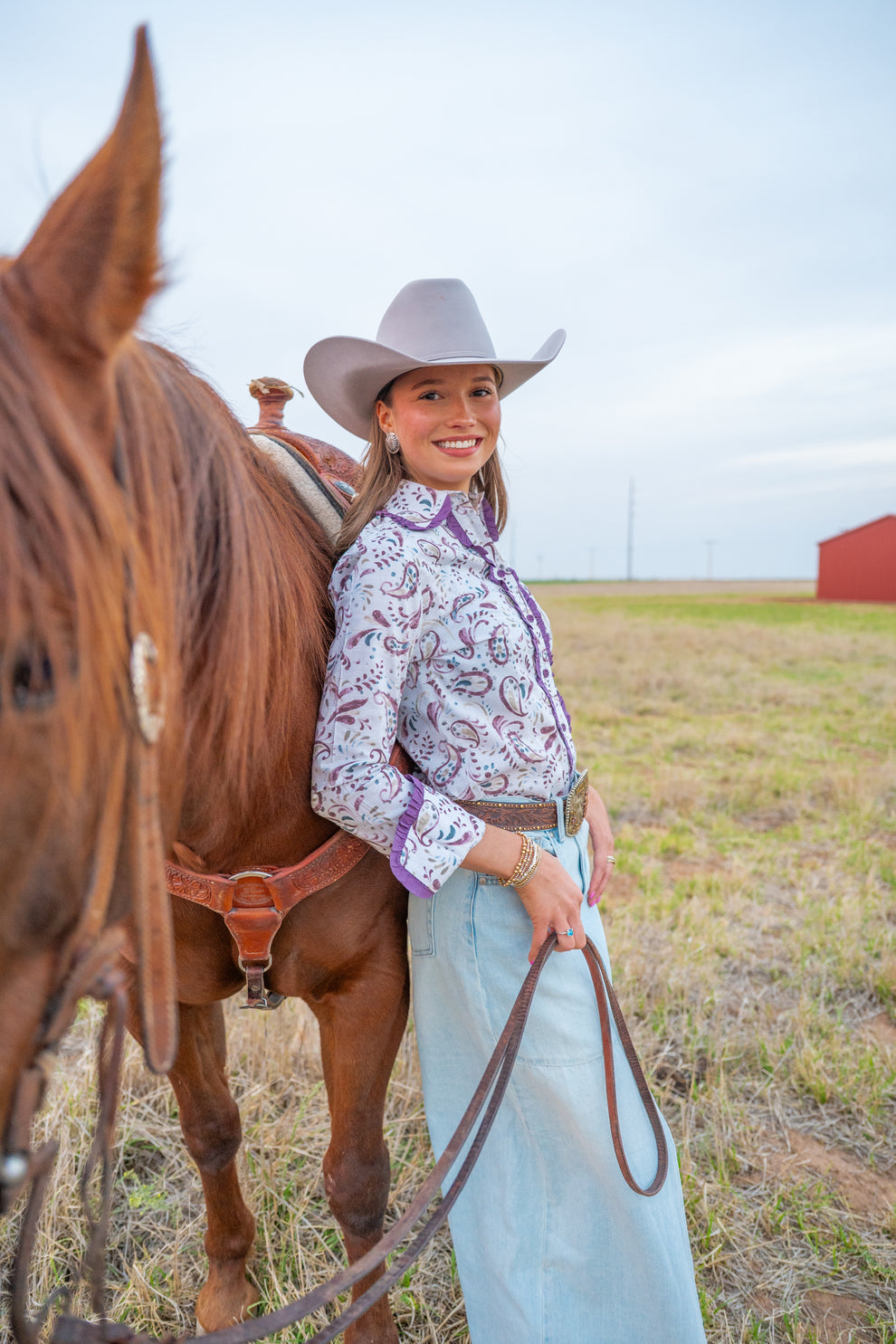 Watercolour paisley meets style in this feminine take on a classic western shirt. Little Lucille’s Painted Paisley Frill Shirt features a flowing paisley print with soft frill detailing. Its tailored fit is feminine, versatile, and easy to wear.