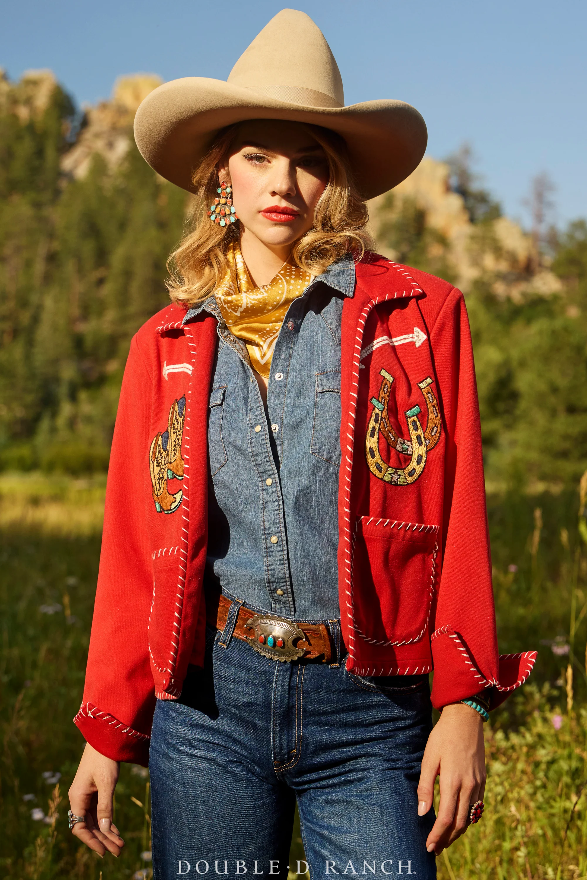 Exclusive to StyleWest, the Double D Ranch Stampede Valley Jacket is made to turn heads. In a bold red poly blend, it offers a lighter-weight alternative to leather while keeping true Western spirit alive. Intricate embroidery and whipstitch trim finish the look, making this jacket as unforgettable as the woman who wears it.