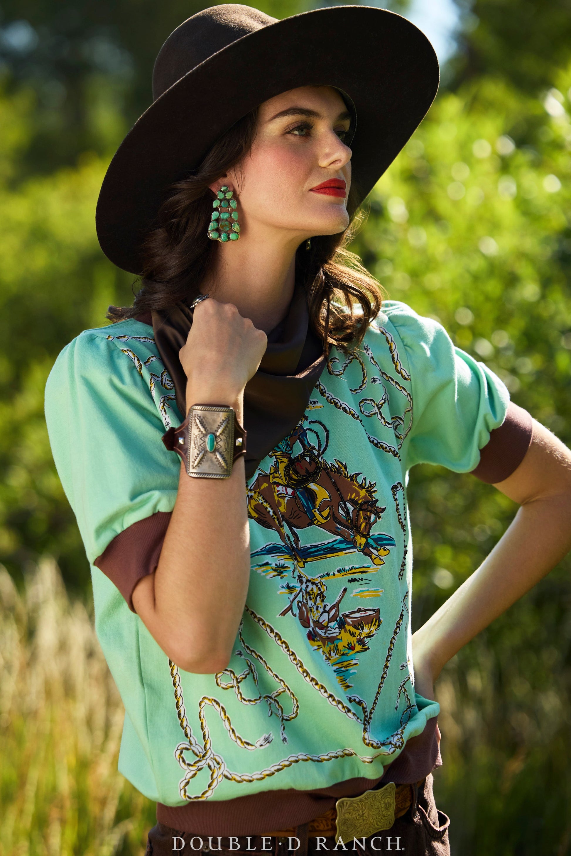Exclusive to StyleWest Australia, this Double D Ranch design is a top with a tale. The Real Cowgirl Top features an adaptation of “Lots of Spunk” the A.R. Mitchell illustration that first introduced us to his artwork and decades later became the cornerstone of this collection. Accented with western rope framing and subtle “DDR” details, the retro mint backdrop is finished with contrasting cuffs, collar, and waistband.