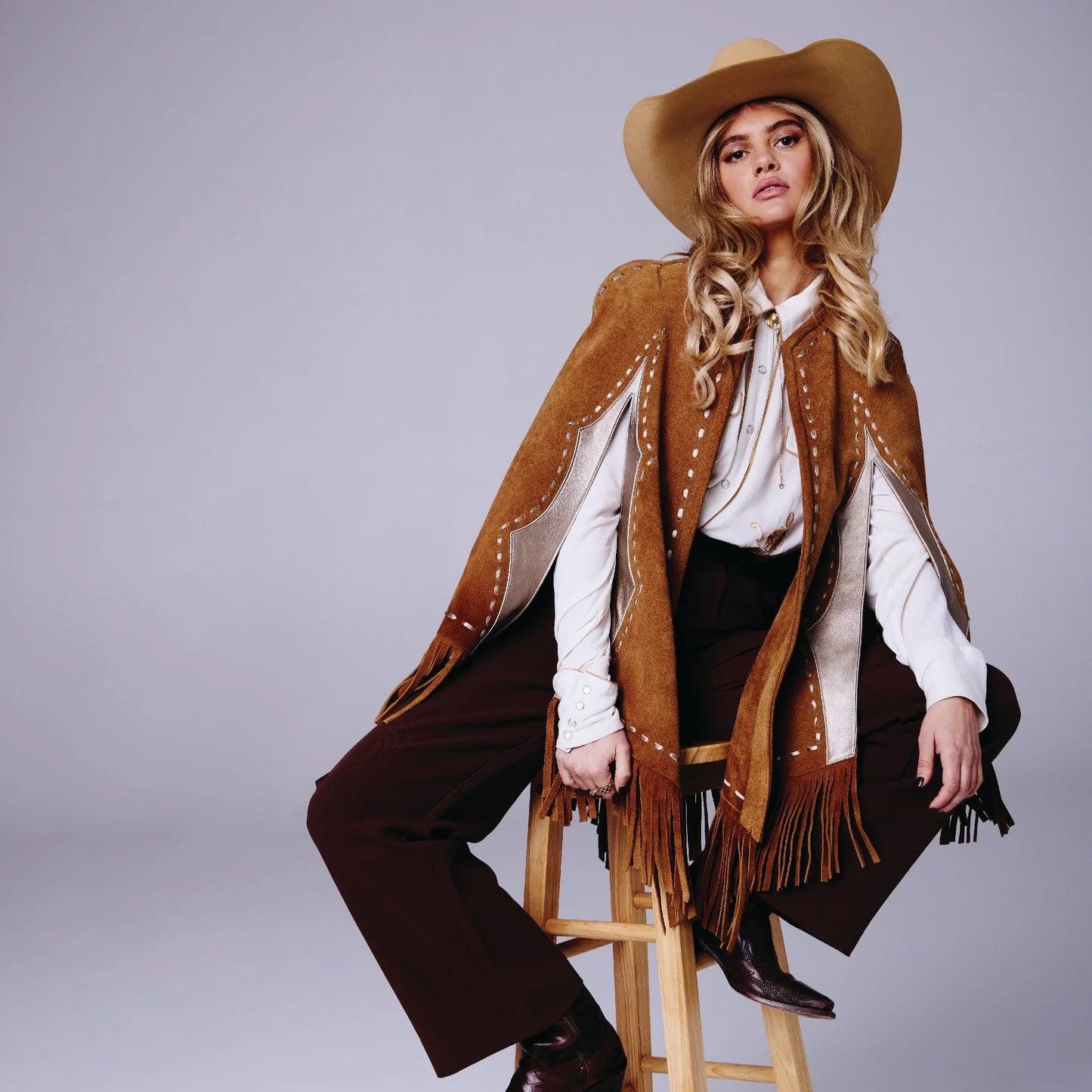 Step into the spotlight with the Bright Lights Metallic Cape, a striking piece inspired by the '70s. It features hand-cut and dyed carmel suede, topped off with silver champagne colored appliqué details, trimmed with fringe, and finished with cross-stitch lacing and western flair arm slits. Not only comfortable to wear, but versatile and can be dressed up or down: wear it to the rodeo, the bar, or keep it casual with jeans.